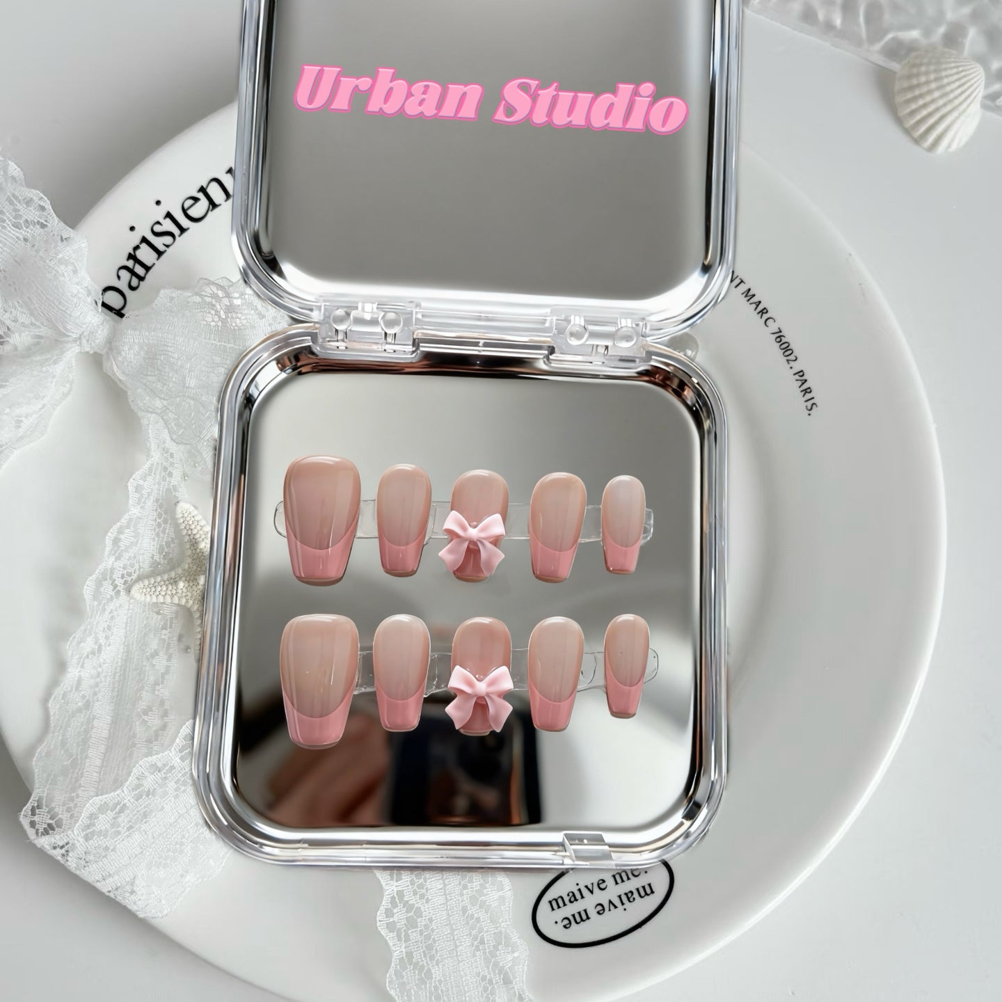 A soft blush-pink French design finished with a 3D ribbon charm. Simple, sweet and elegant—the perfect everyday set for a clean-girl aesthetic with a touch of cuteness.